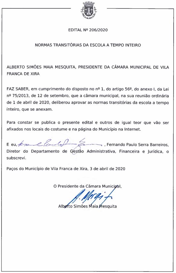 Edital nº 206 da CMVFX - Normas Transitórias da Escola a Tempo Inteiro