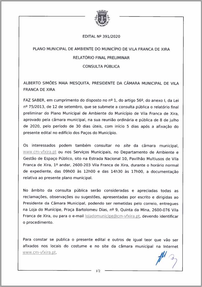 Edital nº 391 da CMVFX - Plano Municipal de Ambiente do Município de Vila Franca de Xira - Relatório Final Preliminar - Consulta Pública