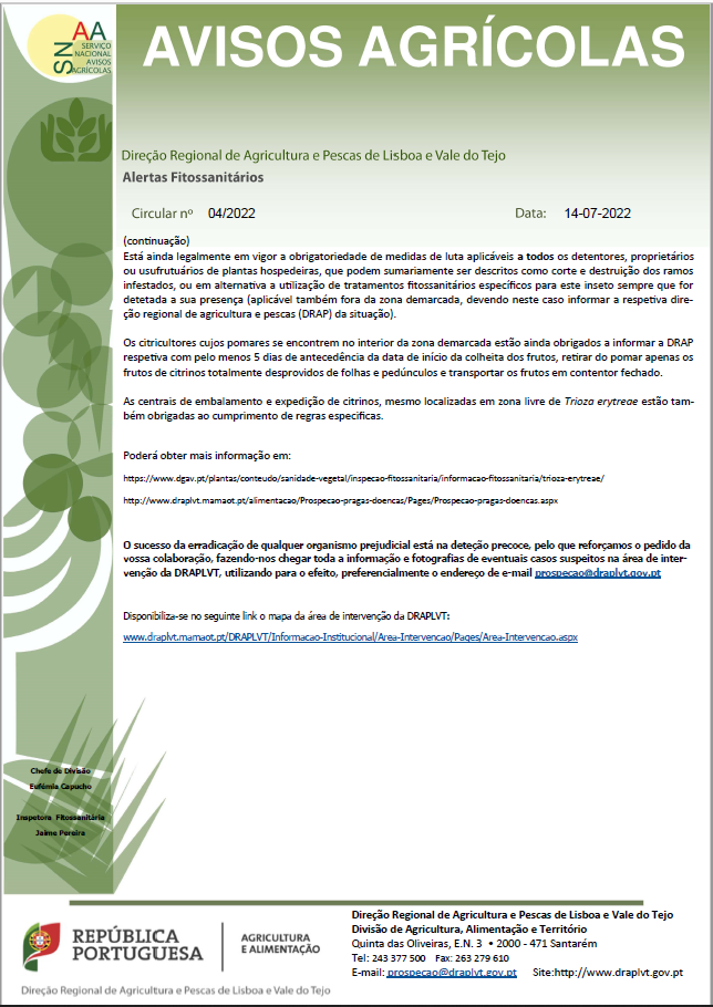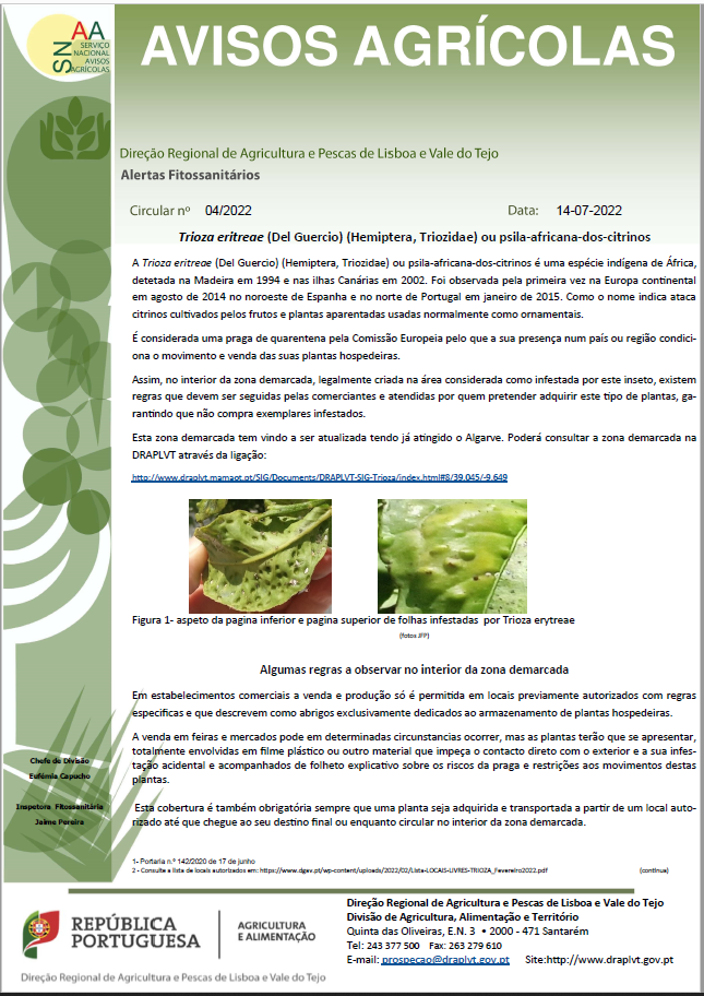 Circular nº 4/2022 - Trioza eritreae (Del Guercio) (Hemiptera, Triozidae) ou psila-africana-dos-citrinos