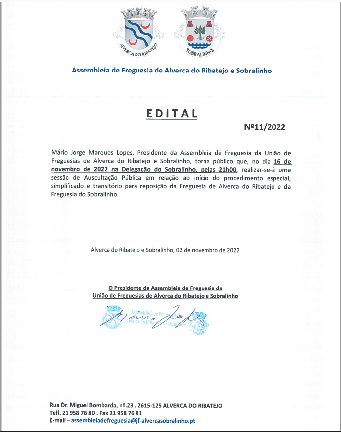 Sessão Auscultação Pública do Início do Procedimento Especial, Simplificado e Transitório para Reposição da Freguesia de Alverca do Ribatejo e da Freguesia do Sobralinho - Delegação do Sobralinho