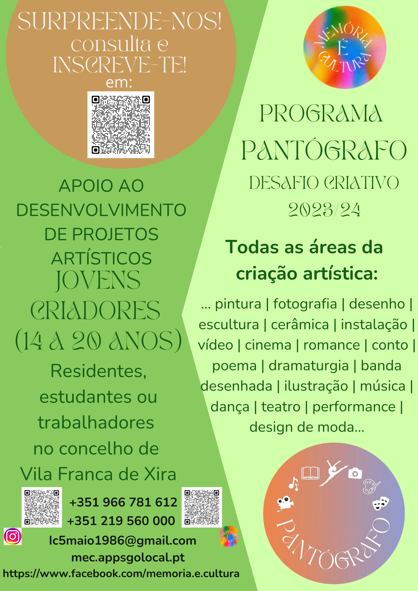 "PANTÓGRAFO-DESAFIO CRIATIVO é o nome do programa de apoio a jovens criadores no Concelho de Vila Franca de Xira, promovido pela Associação Memória É Cultura.